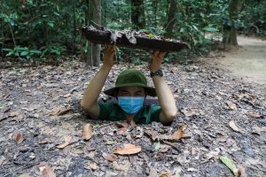 Cu Chiトンネルです。Cu Chiトンネルは昔、戦争によって敵から見えないように、地下の中にトンネルを掘り抜いて、隠れていました。その中では安全なので、兵士が自分で料理を作り、会議や生活などもできました。今、Cu Chiトンネルはベトナムの史跡です。