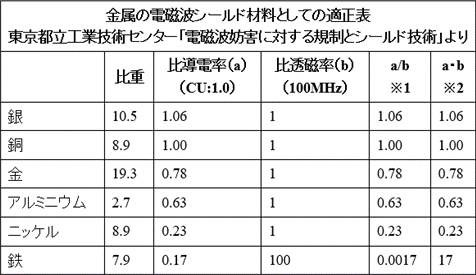 二つ目「シールド性を付与するめっき皮膜の形成」は、銅めっきを施すことです。金属は元々シールド性を有しています。下記に金属毎のシールド性値の表を記載します。表から銀もしくは銅が特に強いシールド性を発揮することがわかると思います。