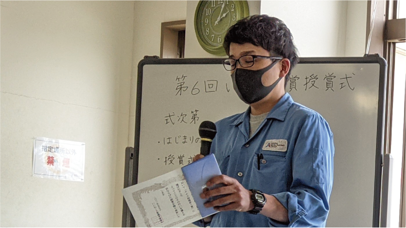 「先ほど吉成さんからもありましたが、私も今回賞をいただくのは初めてで、いつもは私とか吉成さんとかの職責はお断りするのですが、今回は塚本さんが選んでくれたということなので、ありがたくお受けしようかなと思いました。今回は、林君と一緒に作業をさせていただいたんですけれども、実はこの裏にも吉成さんがチェーンを買いに行ってくれたり、色々な手伝いをしてくれたり、もちろん10Gの方々もバックアップをしてくれたり、色々な作業をしてくれて助けられました。やっぱり会社で何かあったときは、みんなでできることを助け合いながら作業できればいいなと思いますので、これからもお手伝いできることがあれば、率先してやっていこうかなと思います。ありがとうございました。」