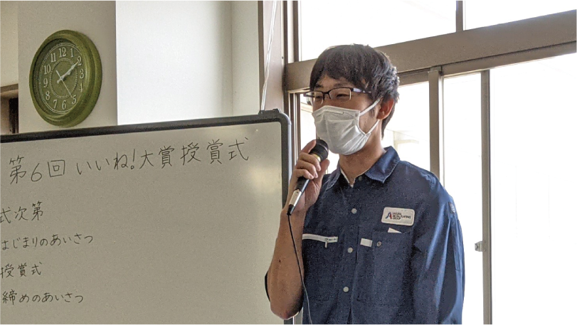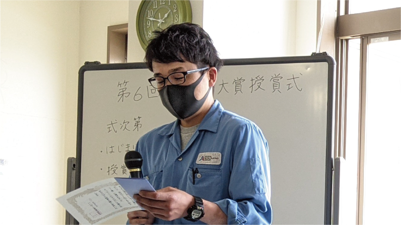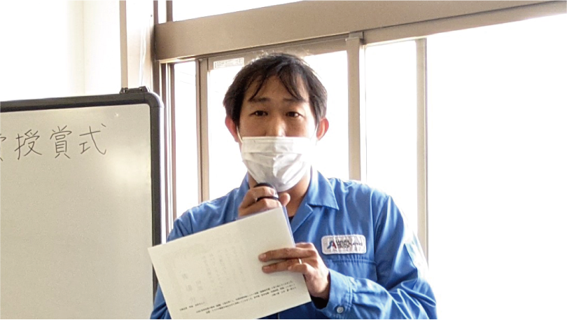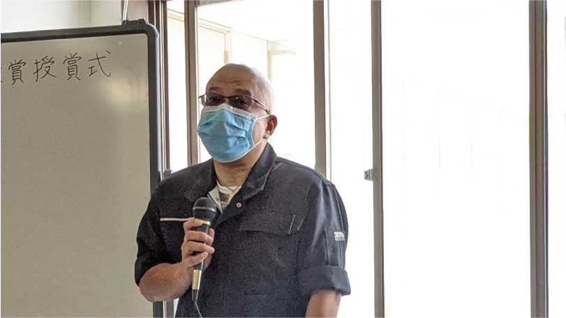 「先ほど吉成さんからもありましたが、私も今回賞をいただくのは初めてで、いつもは私とか吉成さんとかの職責はお断りするのですが、今回は塚本さんが選んでくれたということなので、ありがたくお受けしようかなと思いました。今回は、林君と一緒に作業をさせていただいたんですけれども、実はこの裏にも吉成さんがチェーンを買いに行ってくれたり、色々な手伝いをしてくれたり、もちろん10Gの方々もバックアップをしてくれたり、色々な作業をしてくれて助けられました。やっぱり会社で何かあったときは、みんなでできることを助け合いながら作業できればいいなと思いますので、これからもお手伝いできることがあれば、率先してやっていこうかなと思います。ありがとうございました。」