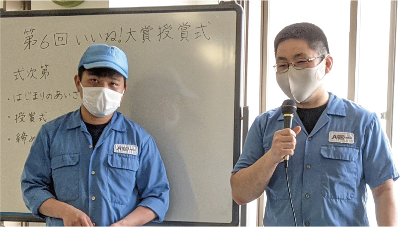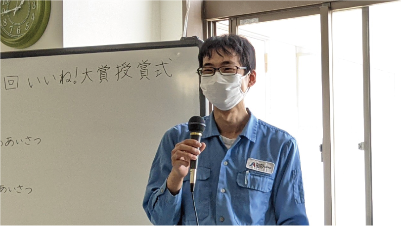 いいね!大賞というのは、働いているみんなが気づいたちょっとした素敵なこと、いいことに対して光をあてようという形で始めました。どうしても会社の中でいいことっていうと、「働くことだから利益につながること」、「上司の命令を聞く」…ちょっと後ろ向きだよね。山本工場長の顔色をうかがって、いい仕事をしてどう評価があがるか?山本工場長のためだけに仕事をしよう!だとか、新原さんの顔色をうかがっていればいいんじゃないか、とか…この会社はそういうのは少ないかもしれないけど、会社というのはそういうものなんですよ。